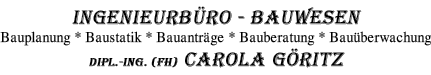 Ingenieurbüro - Bauwesen Dipl.Ing. (FH) Carola Göritz - Schwäbische Str. 16 - 16547 Birkenwerder - Tel. 0 33 03 - 50 14 56 - info@goeritz-sydow.de